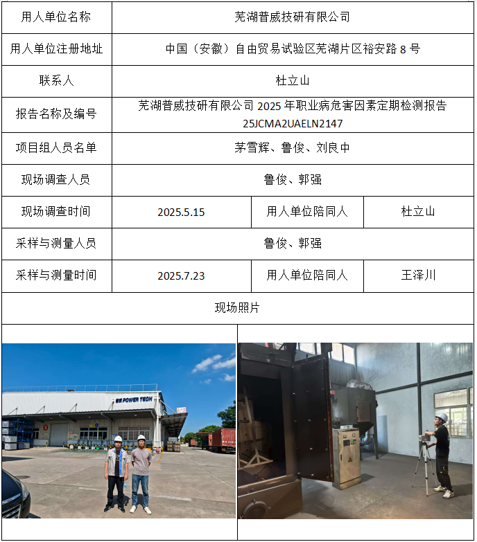 芜湖普威技研有限公司2025年职业病危害因素定期检测报告