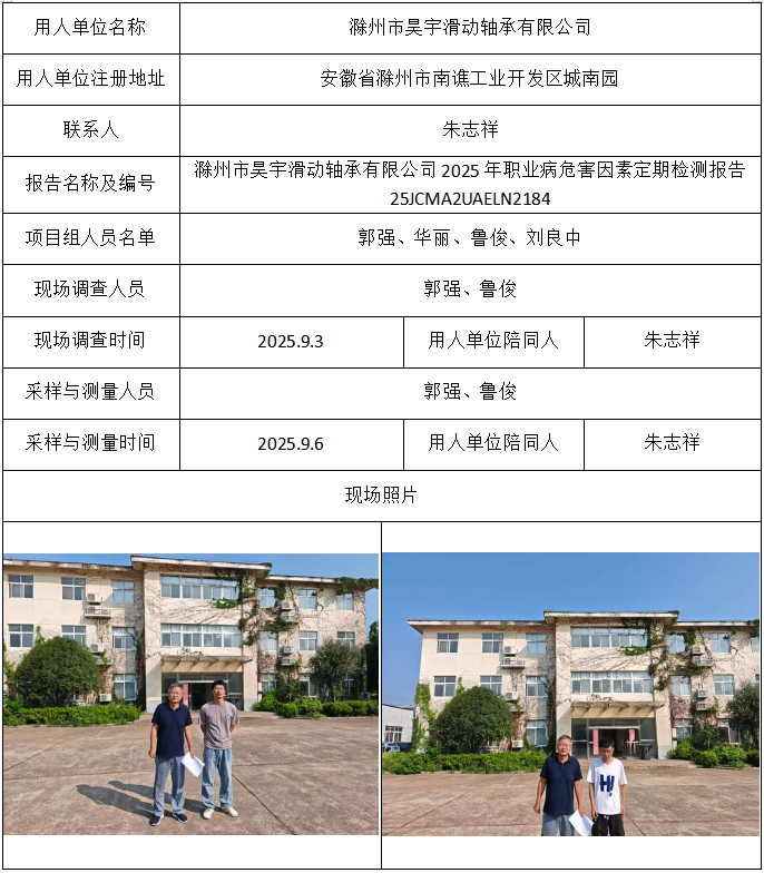 滁州市昊宇滑动轴承有限公司2025年职业病危害因素定期检测报告