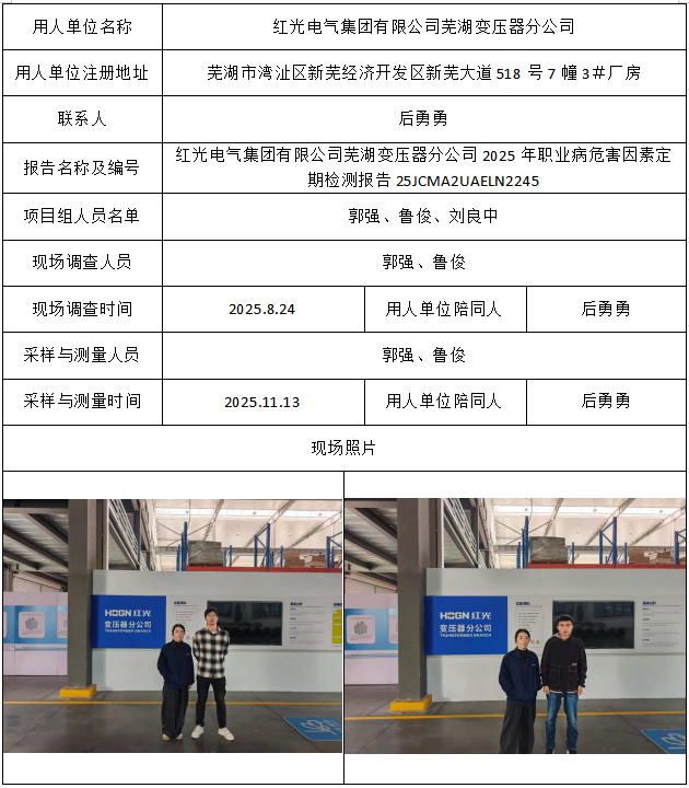 红光电气集团有限公司芜湖变压器分公司2025年职业病危害因素定期检测报告