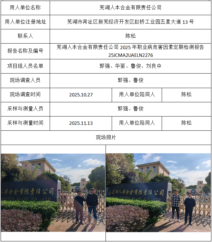 芜湖人本合金有限责任公司2025年职业病危害因素定期检测报告