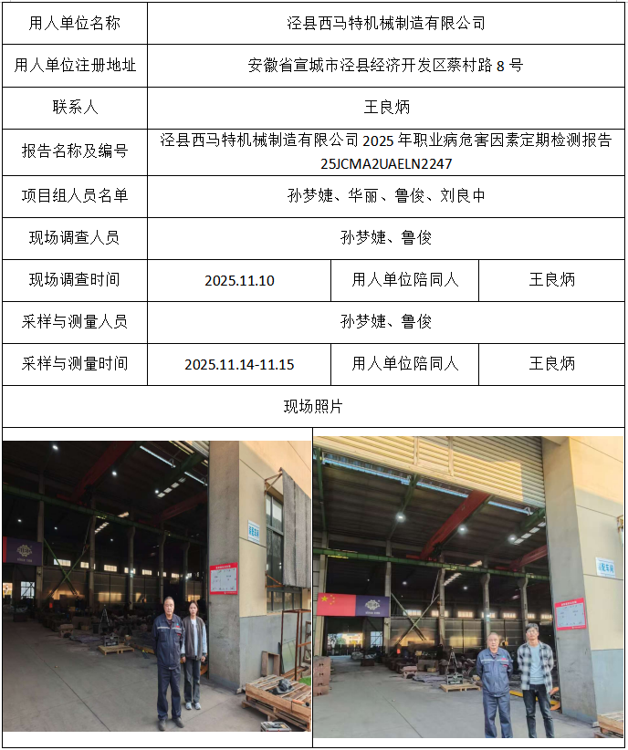 泾县西马特机械制造有限公司2025年职业病危害因素定期检测报告