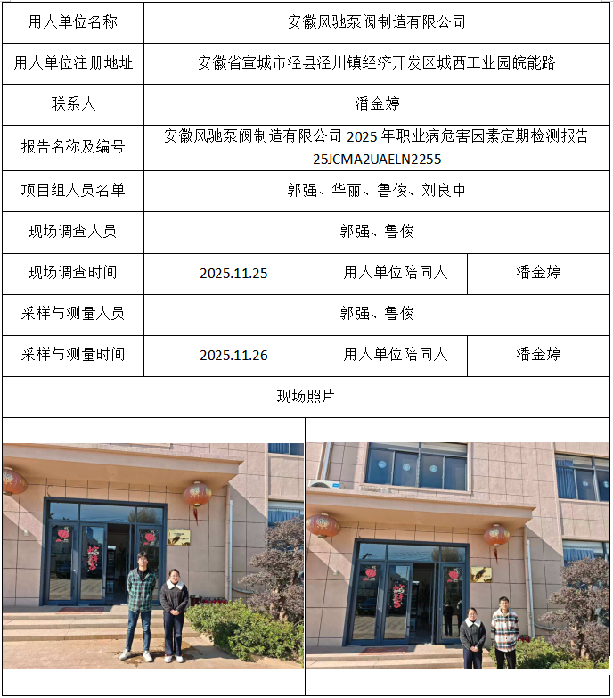 安徽风驰泵阀制造有限公司2025年职业病危害因素定期检测报告