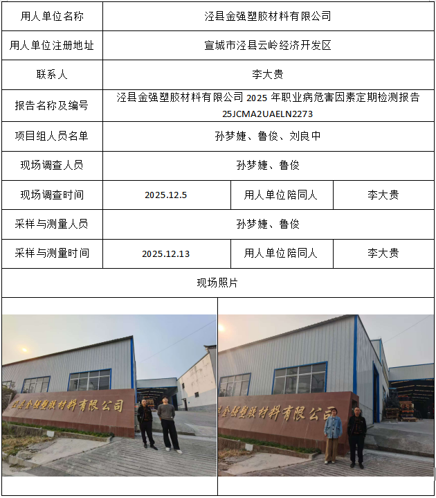 泾县金强塑胶材料有限公司2025年职业病危害因素定期检测报告