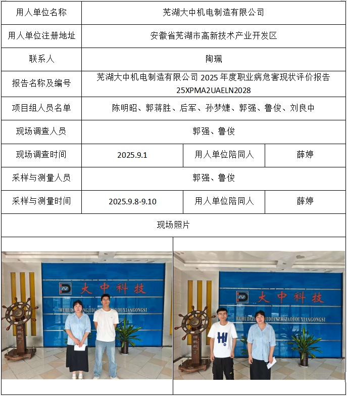芜湖大中机电制造有限公司2025年度职业病危害现状评价