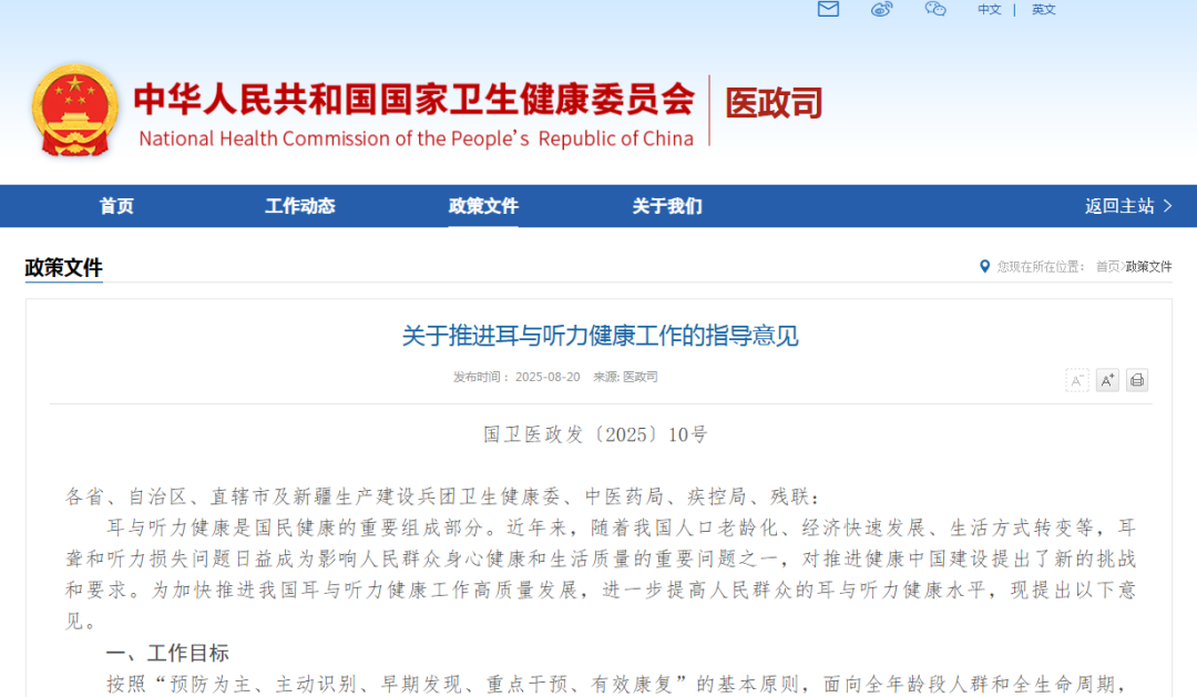 耳与听力健康是国民健康的重要组成部分。近年来,随着我国人口老龄化、经济快速发展、生活方式转变等,耳聋和听力损失问题日益成为影响人民群众身心健康和生活质量的重要问题之一,对推进健康中国建设提出了新的挑战和要求。为加快推进我国耳与听力健康工作高质量发展,进一步提高人民群众的耳与听力健康水平,现提出以下意见。